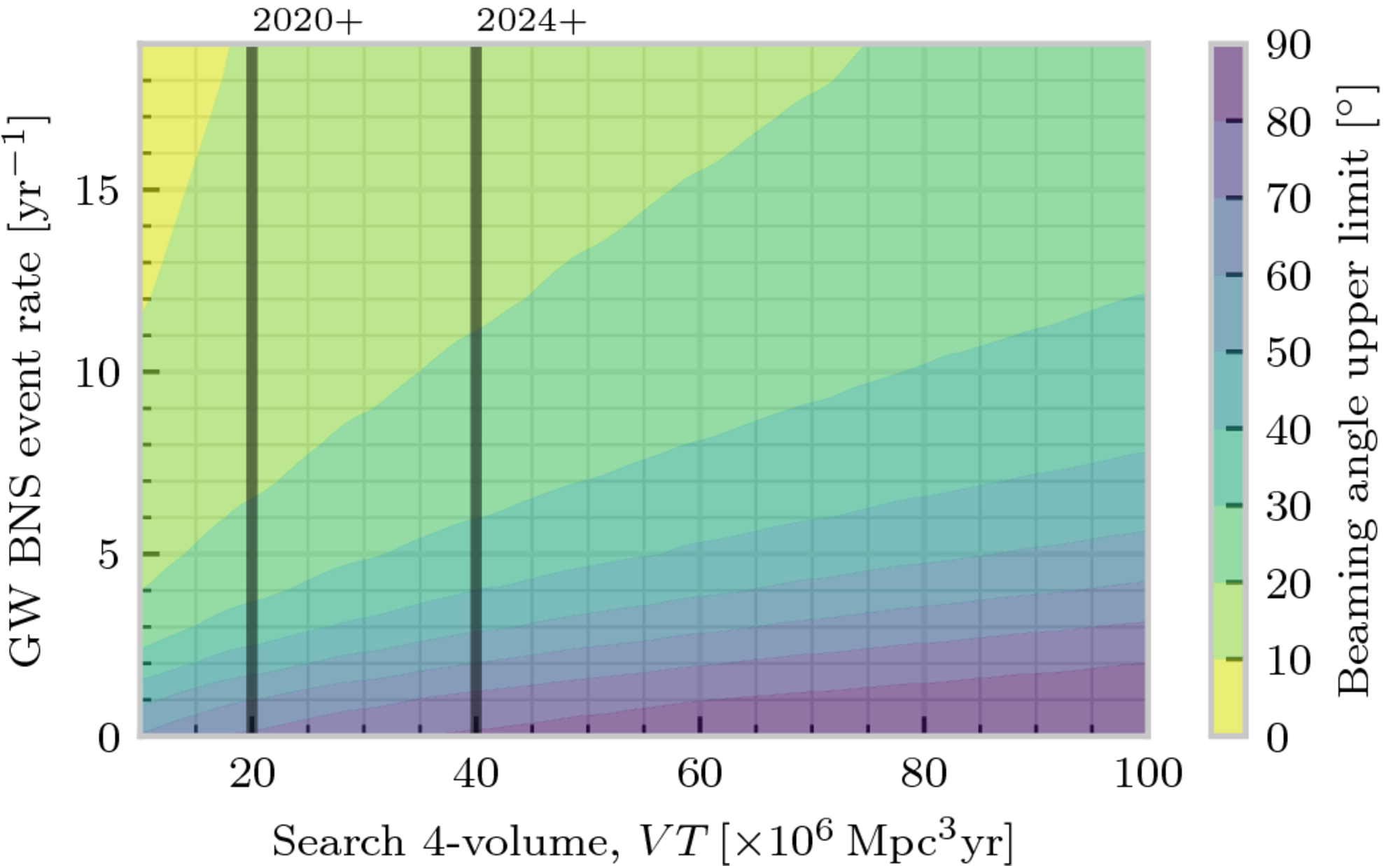 An intuitive way to think about how doing this works goes a bit like this: say you detect gravitational waves from a BNS, but you don’t see a GRB to go with it. What does that tell you? It tells you that the emission is beamed (so the opening angle isn’t 90-degrees), but you can’t say an awful lot about the shape of the beam from just one observation. However, if after watching for longer, you find that you see one GRB for every ten BNS observations you can start to infer that the beam must be quite small (and so you need to be reasonably “lucky” to be able to see it). Likewise, if you saw nine GRBs to go with your ten BNS events you might conclude that the beam was pretty wide.