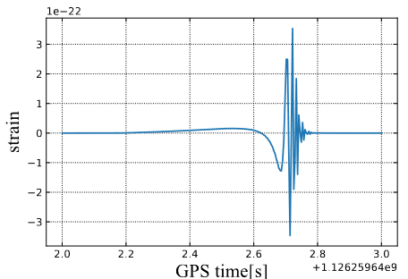 We often divide the waveform into three sections; the inspiral, which is the leftmost part (and therefore the part earliest in the evolution of the system), which is produced as the two objects are still orbiting each other; the merger, which is the part immediately around the peak, where the two black holes touch and then combine; and the inspiral, which is the last part of the waveform, and produced by the final black hole radiating excess energy. The first plot, which I’ve taken from the paper, shows what we expect one of these BBH signals to look like. The normal systems we try to observe have this pattern, as the two black holes have orbited each other for a (very) extended period of time, and continue to do so right up until they collide and merge.