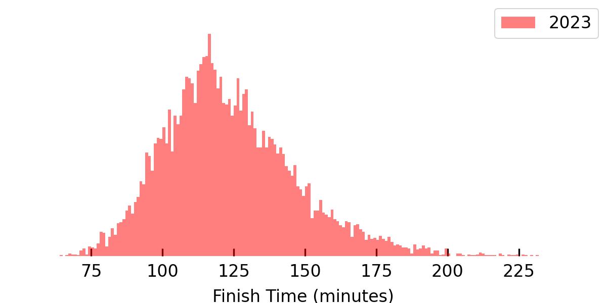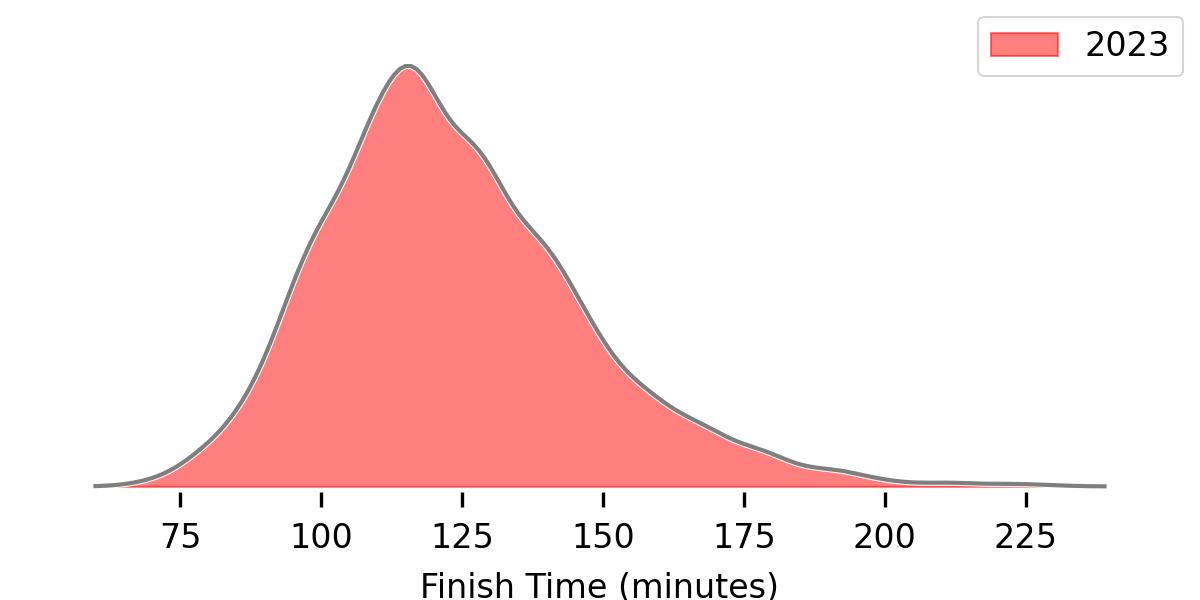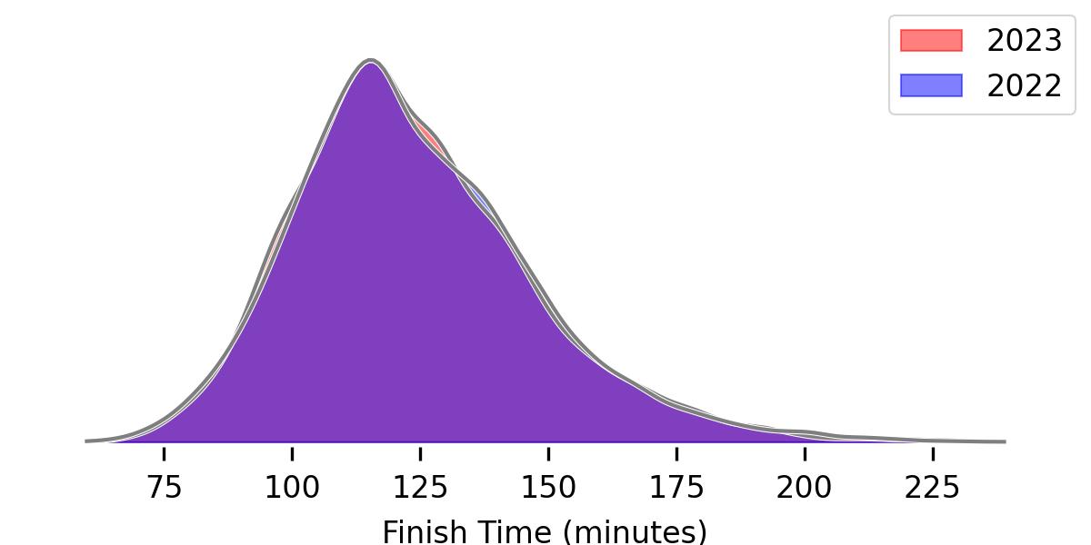 I was expecting a noticeable set of “jumps” or spikes in the data around what people considered good times (for example, around 90-minutes and the 2-hour mark). I was surprised to find those aren’t really evident in the histogram of results, and applying a kernel density estimate they’re completely smoothed out.