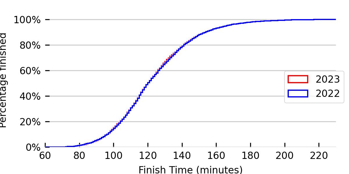There are some interesting features in these distributions. First is the long tail, which is perhaps not very surprising, but gives the distribution a pleasant non-Normal character stretching right out close to the four hour mark. The histogram possibly does show a feature at 150 minutes (but it’s a bit hard to be sure by eye); it’s possible that this was from one of the pace groups (there were pacing runners at ten minute intervals from 90 minutes all the way up as far as I could see on the day).