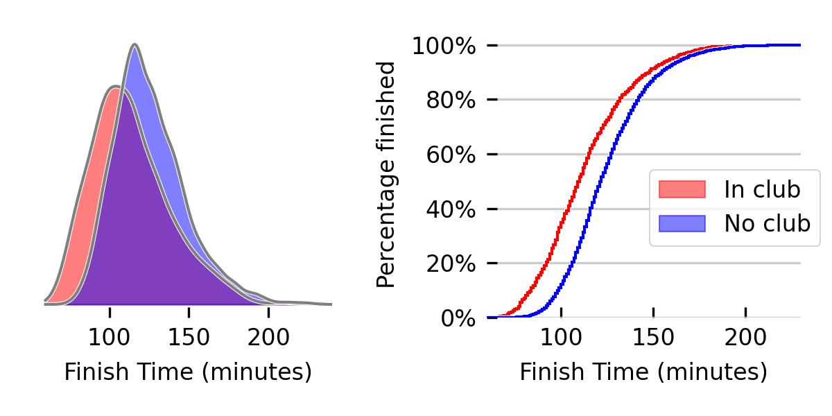 The data I’ve downloaded don’t have a lot of additional information beyond the finish times, except they do list the name of a runner’s club. I figured I might as well have a look at how the distributions of club and non-club runners compare, and I’ll be honest, I was surprised.