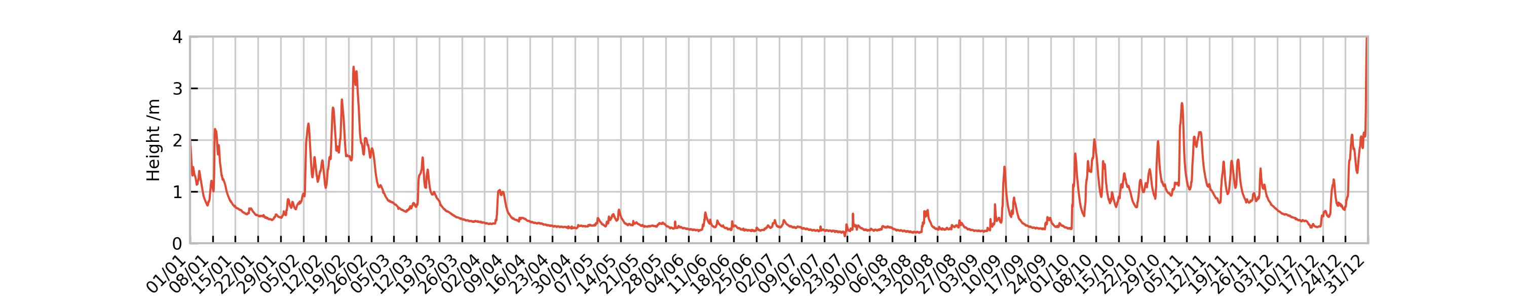 The real question for me is how long it will take for the river to drop below around 1.6-metres once it’s exceeded that. That’s normally a reasonable rule of thumb for what produces a managable stream on the stretch further down the river where we row. Looking at the data, without doing any serious analysis it seems like the time to half the height of the river is around 24 hours once the rain stops. In this post I’ve included a plot of a four day period after heavy rain in September showing how the level gradually declines once the rain stops.